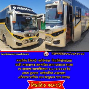 সিলেট হইতে বিয়ানিবাজার : সকাল ৭ টা৪৫ মিনিট,— ১১ টা,— দুপুর ২ টা,— বিকাল ৩০ মিনিট,— ও ৭ টা। বিয়ানিবাজার হইতে সিলেট: সকাল ৮ টা, ৯ টা,১১ টা ১০ মিনিট, দুপুর ২ টা, ও বিকাল ৫ টা। কাউন্টার সমুহের মোবাইল নং: সিলেট বাস টার্মিনাল কাউন্টার:০১৩৪৫ ৬২৩৪৭০, অভারব্রীজের নীচ ( বান্দ) কাউন্টার: ০১৩৪৫ ৬২৩৪৭১, জকিগঞ্জ কাউন্টার: ০১৩৪৫ ৬২৩৪৭২,